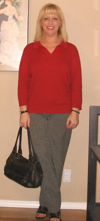 Thrifted Items: Red sweater 99 cents Karen Scott, black bracelet, black leather purse $8 Fossil.
