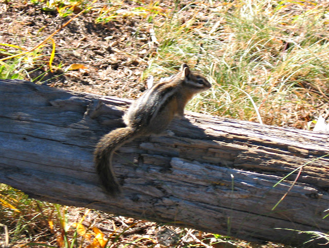 We saw a couple of these cute little chipmunks scampering around. This one came nearly right up to my shoe as I was sitting on a bench in the woods. I think he was quickly ascertaining if I would feed him before bounding off again. There were signs all around NOT to feed the wildlife, but from the looks of this little guy I don't know if this rule has been totally complied with.