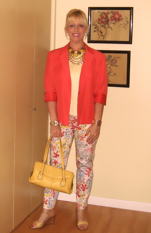 These floral pants (worn more casually here) were getting very baggy on me so I did a little sewing alteration to slim them down a bit. I dressed them up with a blazer and low wedge sandals and doubled up on the statement necklaces. I'd seen other bloggers do this and liked the effect.